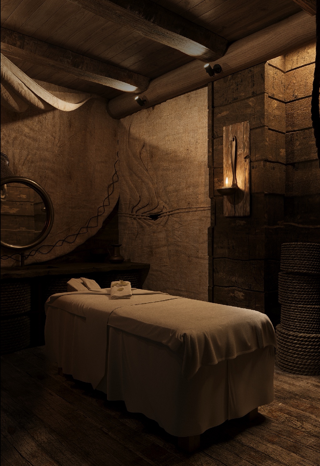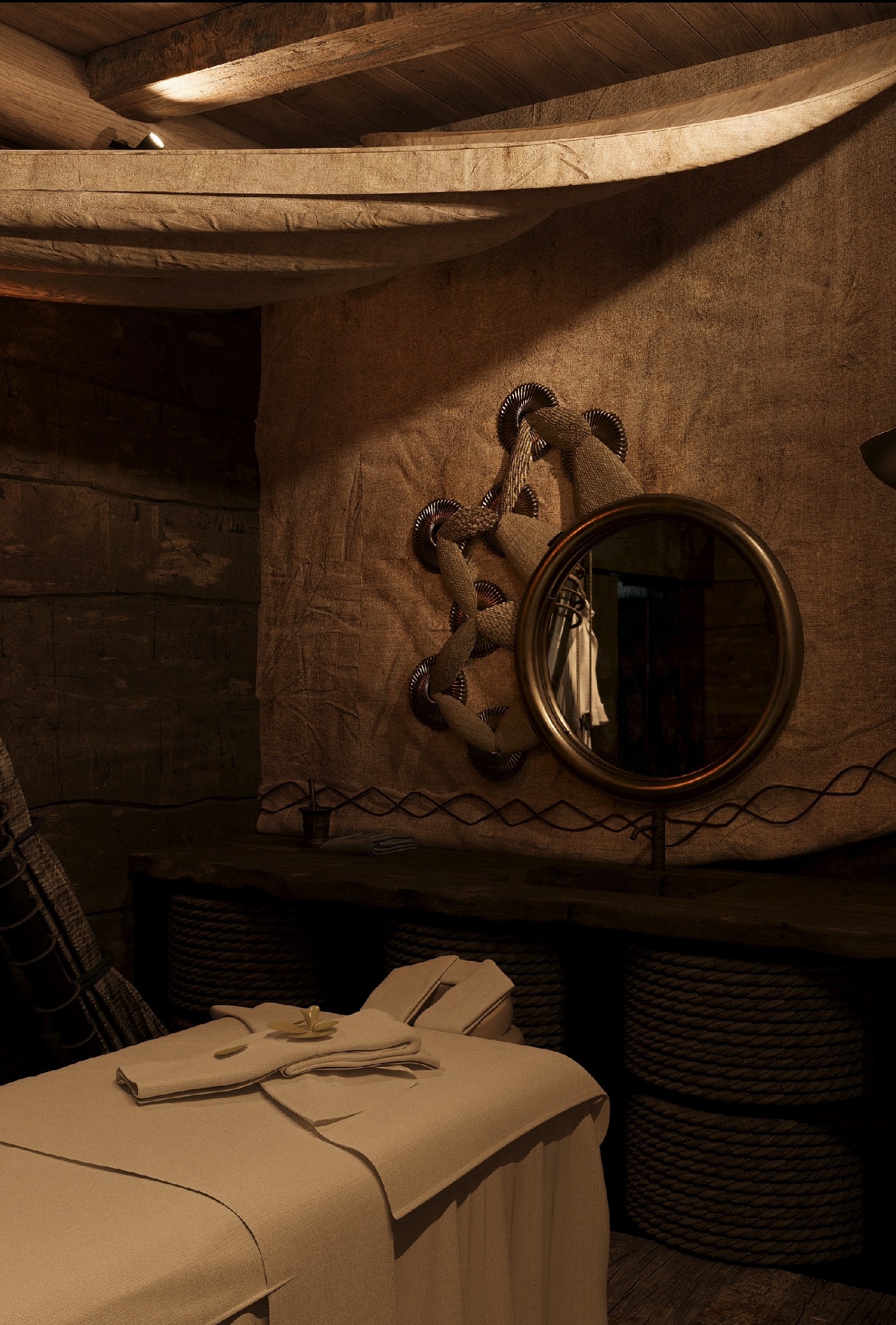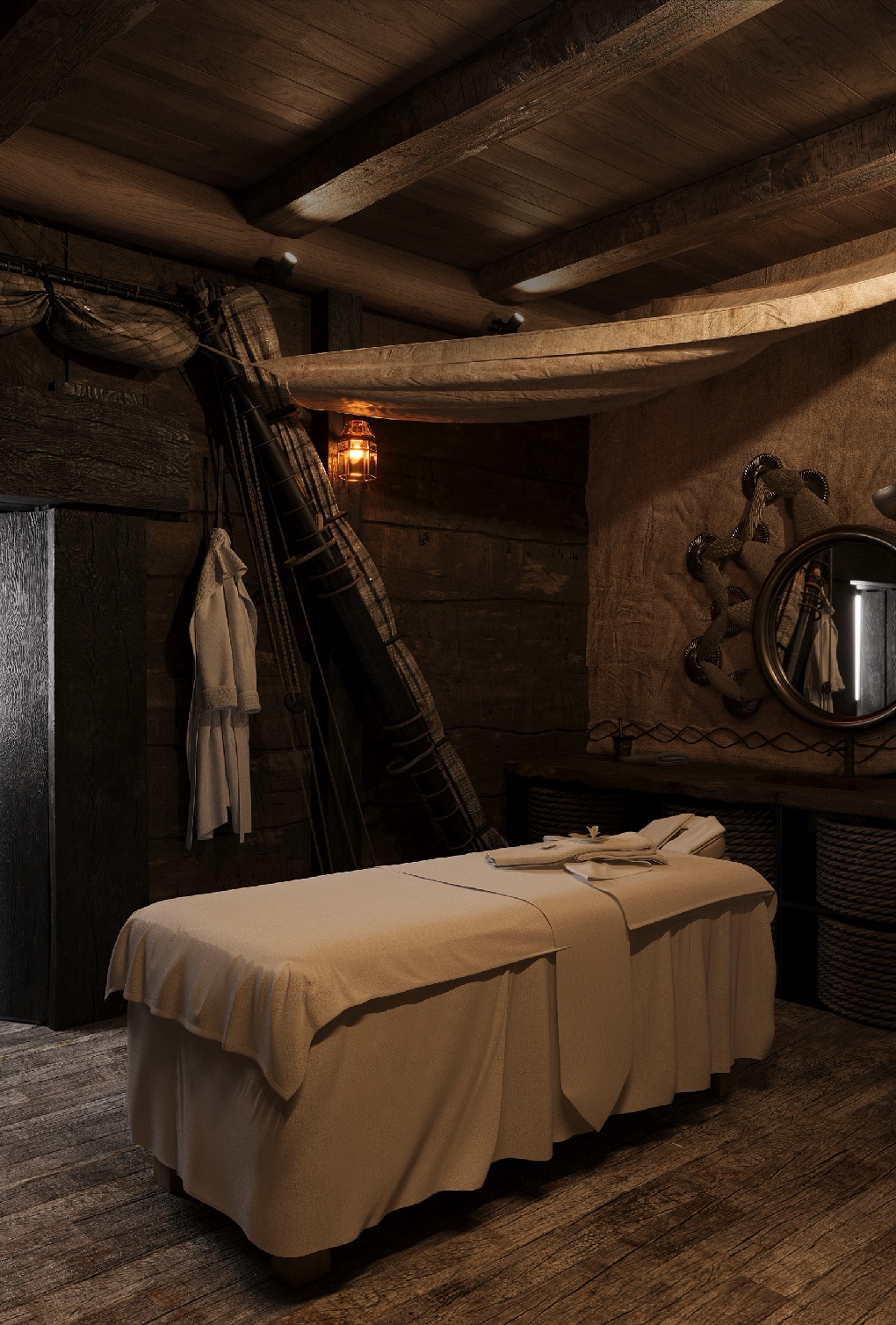 Массажный кабинет в стиле склада с мотками канатов, мачтами и тканями для парусов