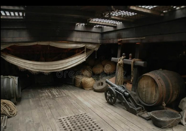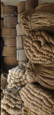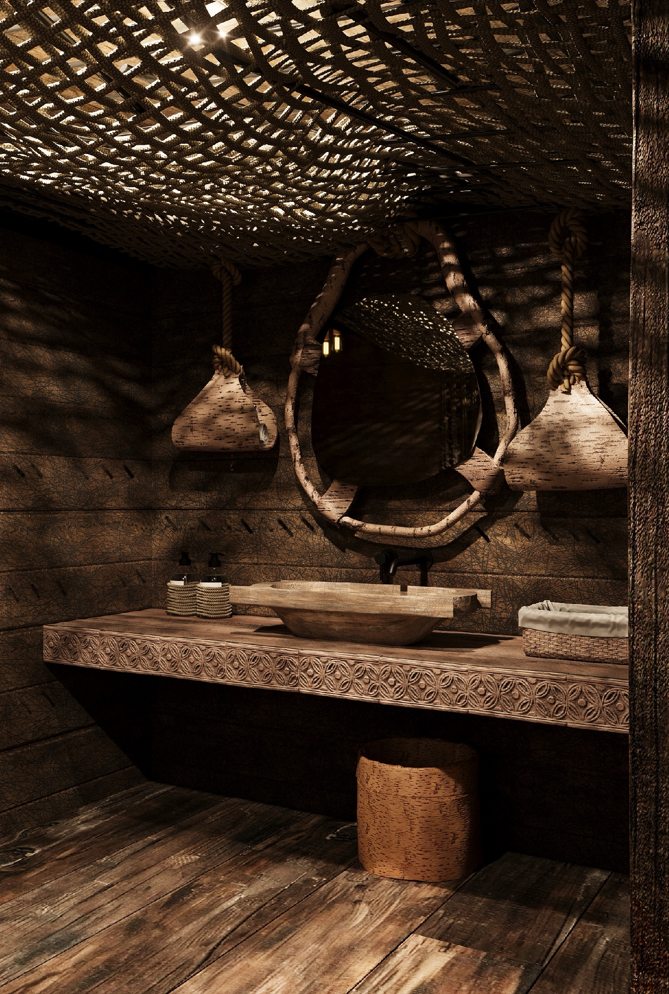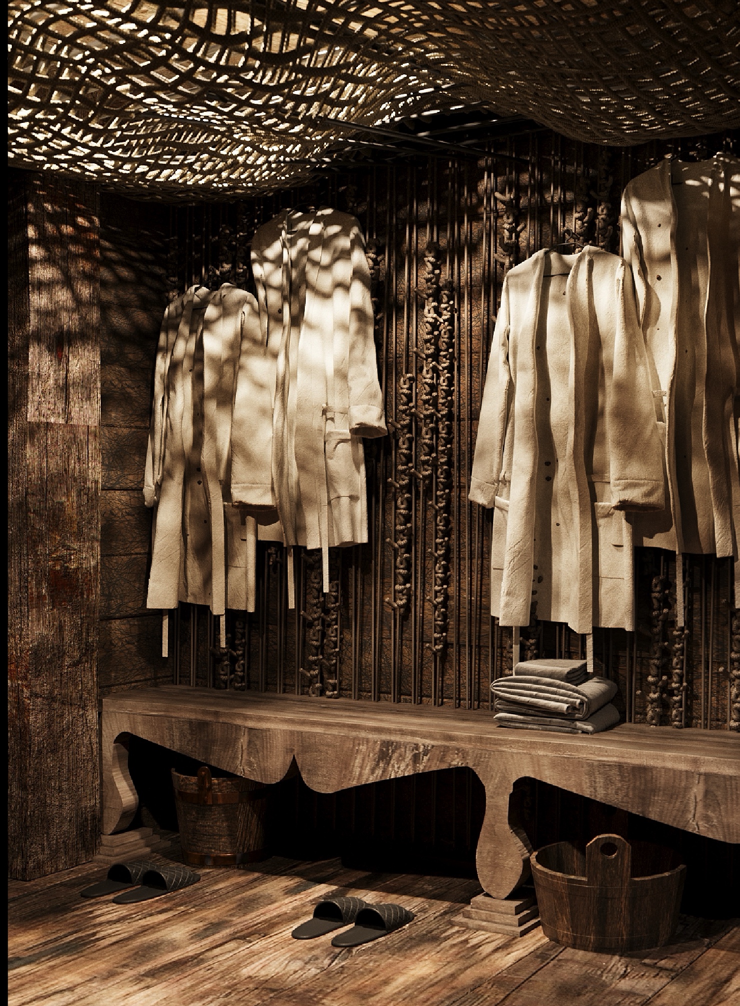 Массажный кабинет в стиле склада с мотками канатов, мачтами и тканями для парусов